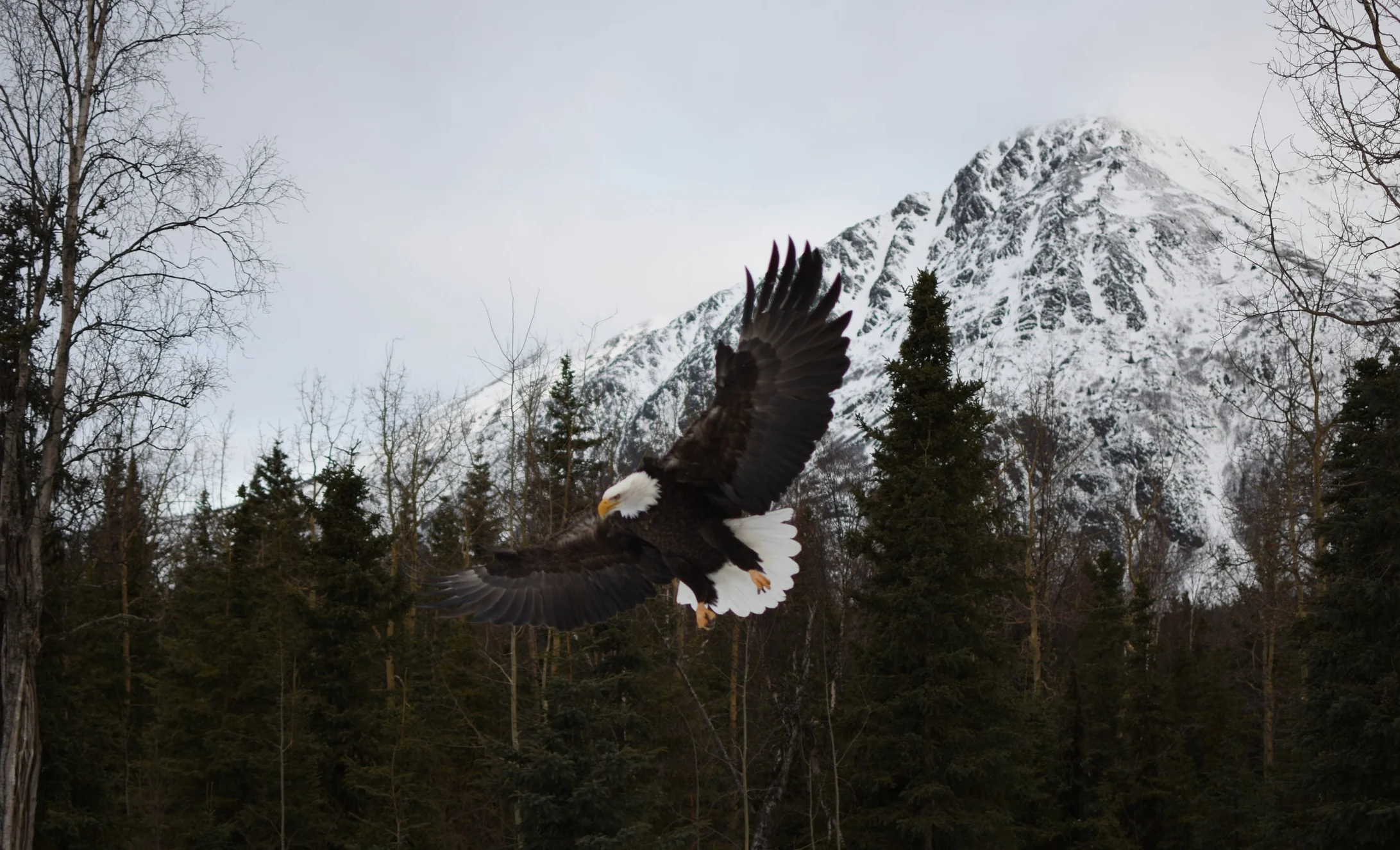 A Bald Eagle swoops down to feed on the shore of the Kenai River.
