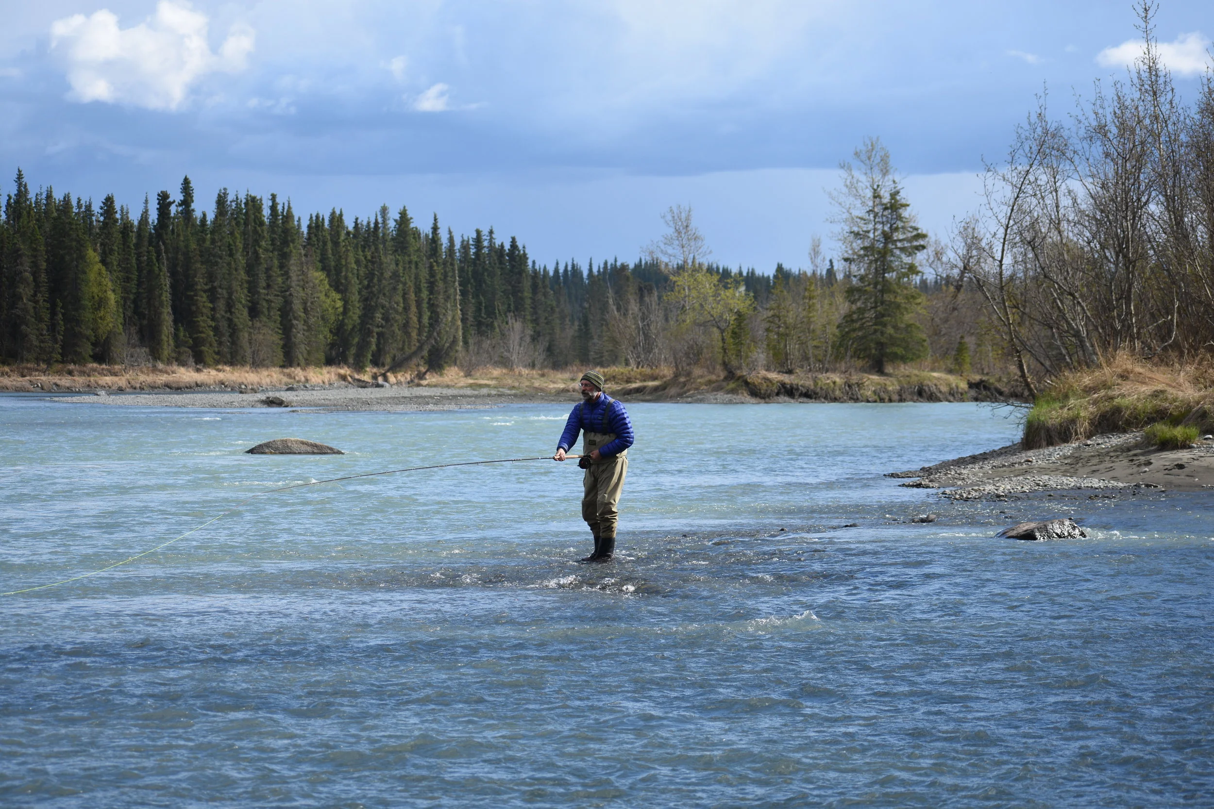Doug setting up a snap-t on a classic king salmon run. Part of the enjoyment of spey fishing is the solitude and rhythmic casting and swinging through the run.
