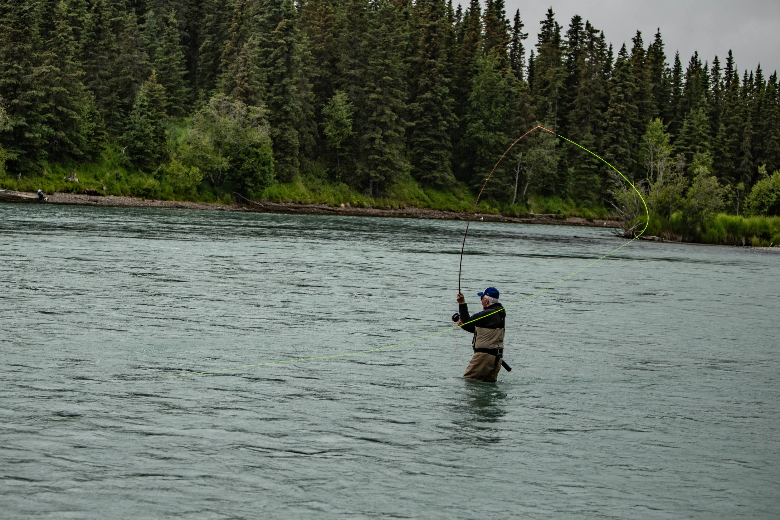 Rich sending a big spey cast across the river! We lost count of how many King Salmon he hooked this day!